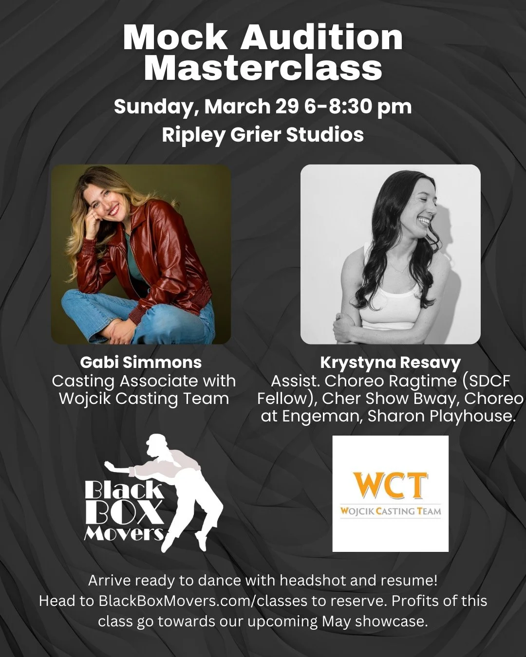 Join us for a Mock Audition Masterclass with Krystyna Resavy (Assist. Choreo Ragtime - SDCF Fellow, Cher Show Broadway, Choreographer at Engeman - Sharon Playhouse) and Gabi Simmons (Casting Associate with Wojcik Casting) to receive advice, learn what happens behind the table, and take the time to coach your dance audition. Dancers will have the chance to dance and receive direct feedback, and then have the space for a Q&A at the end of the class.